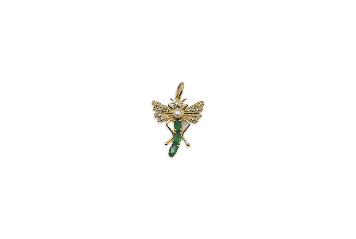 14K Gold Diamond, Emerald, & Pearl Grasshopper Charm