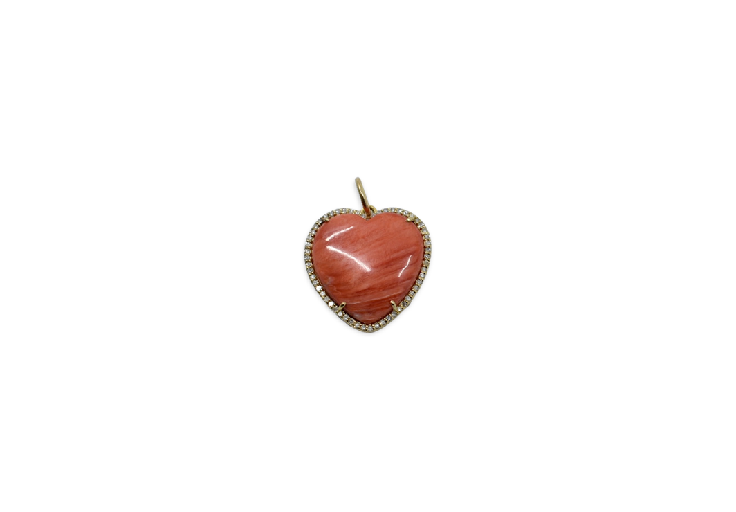 14K yellow gold orange shell heart charm with pavé diamond edge.
