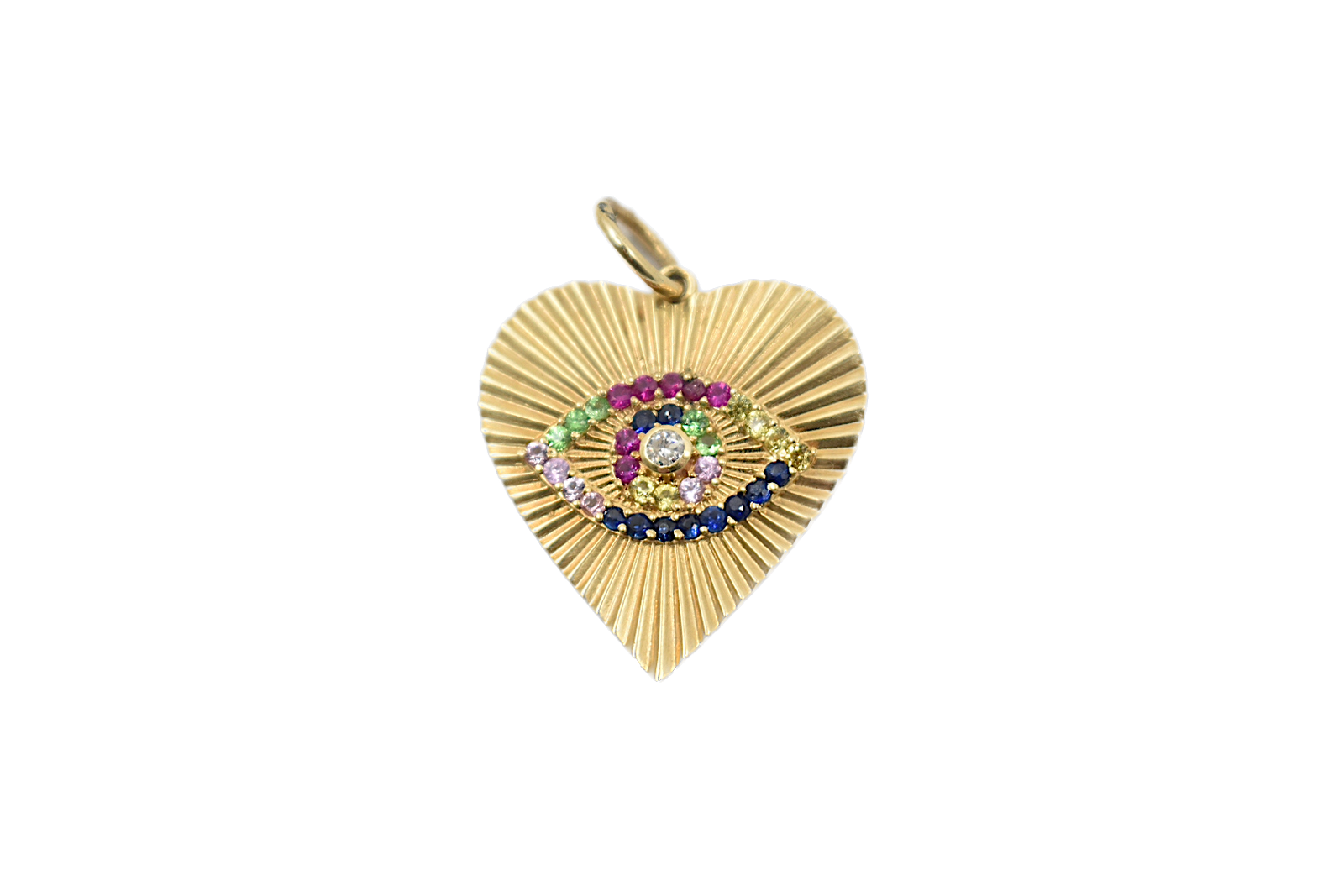 14K yellow gold fluted heart with diamond & multi sapphire evil eye in the center.