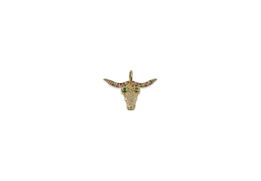 14K yellow gold longhorn bull with diamonds and multi sapphires.