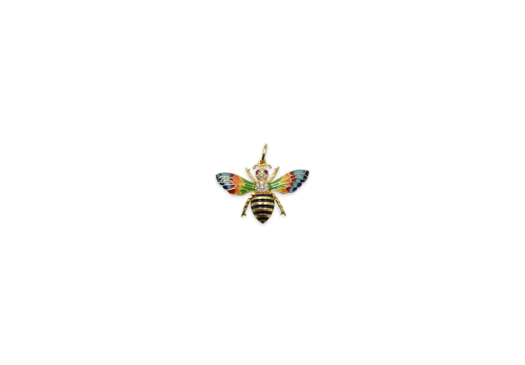 14K yellow gold dragonfly with rainbow enamel, single cut diamonds, and rubies.