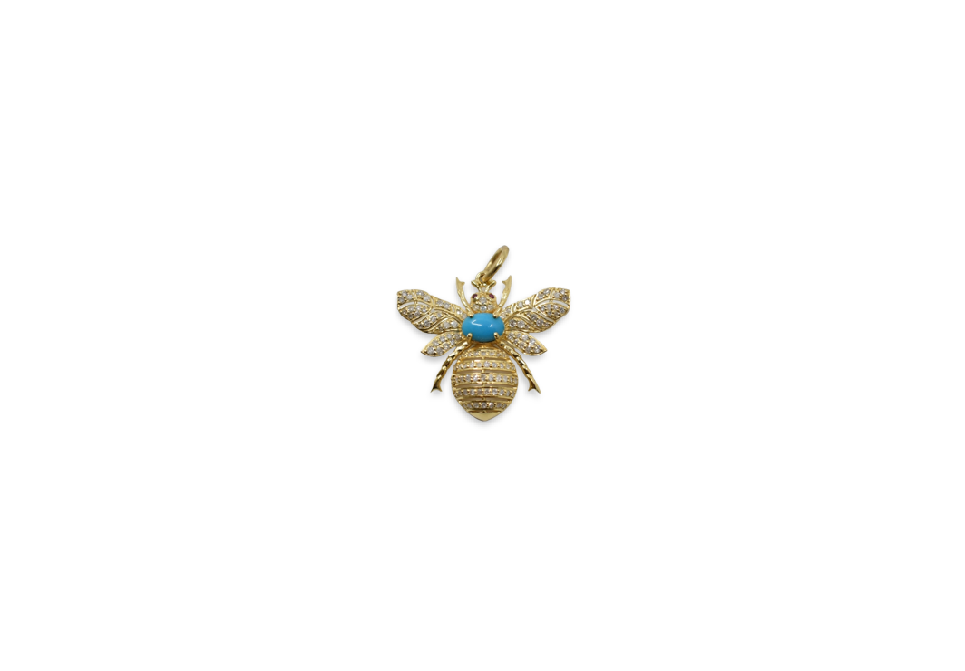 14K yellow gold insect with single cut diamonds and oval cut turquoise.