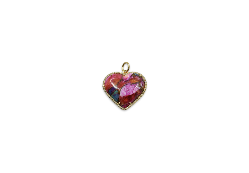 14K yellow gold turquoise and pink shell mix heart with pavé diamond heart.