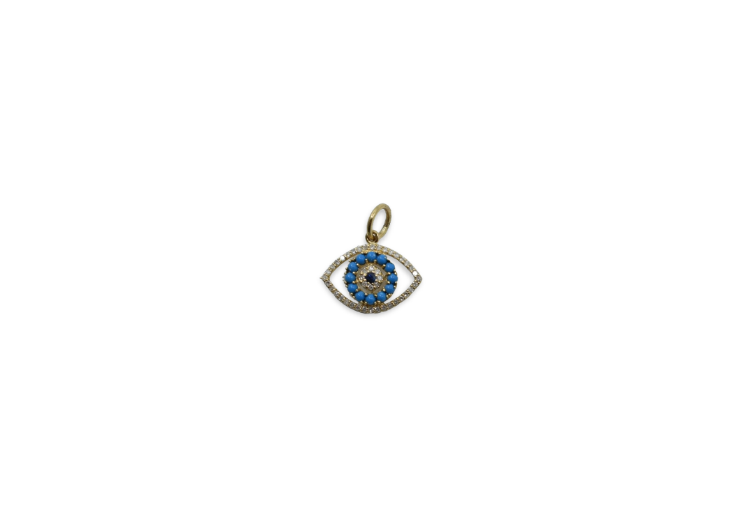 14K yellow gold evil eye with diamonds, turquoise, and blue sapphire.