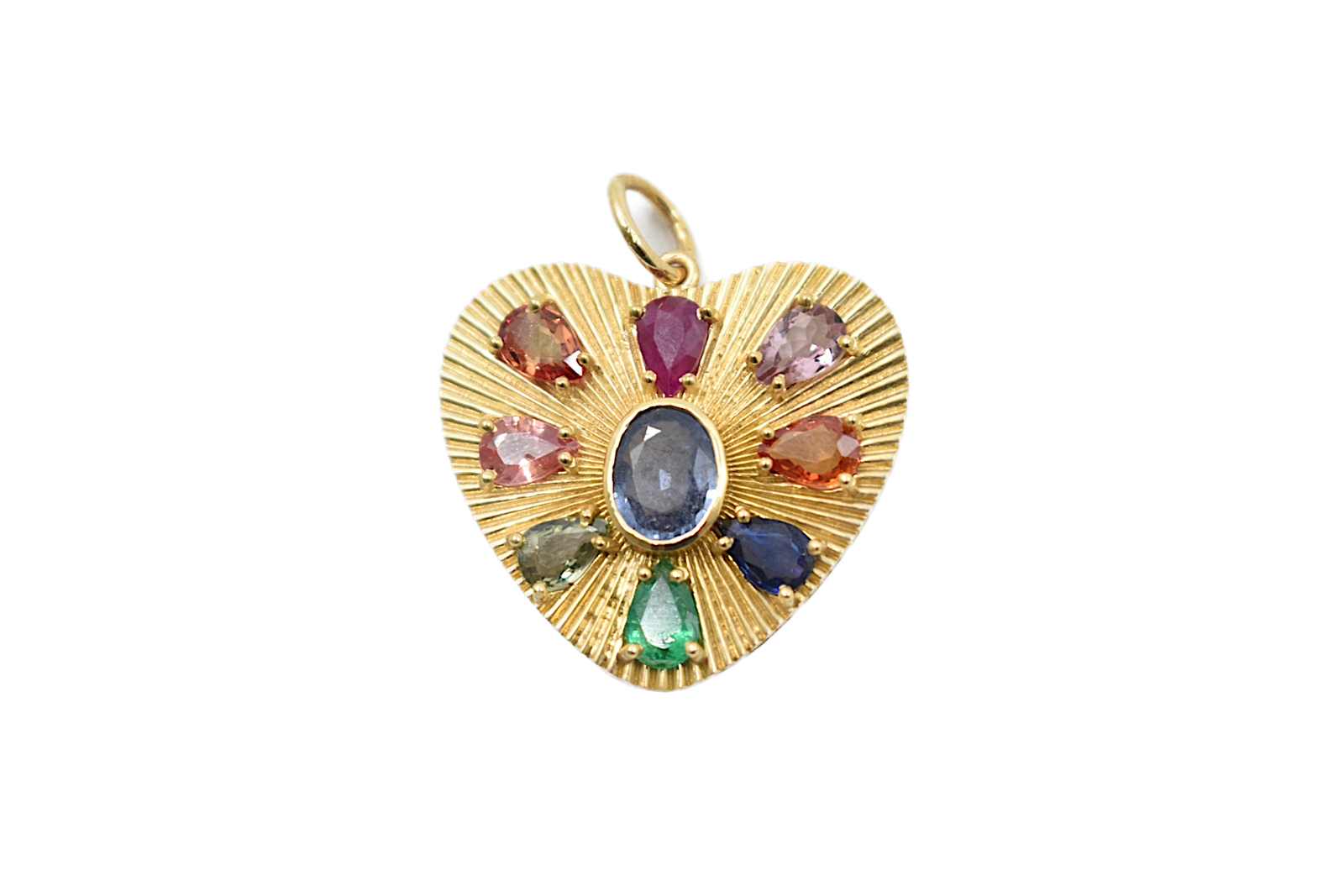 Oval & pear cut multi sapphires studded in a 14k yellow gold fluted heart.