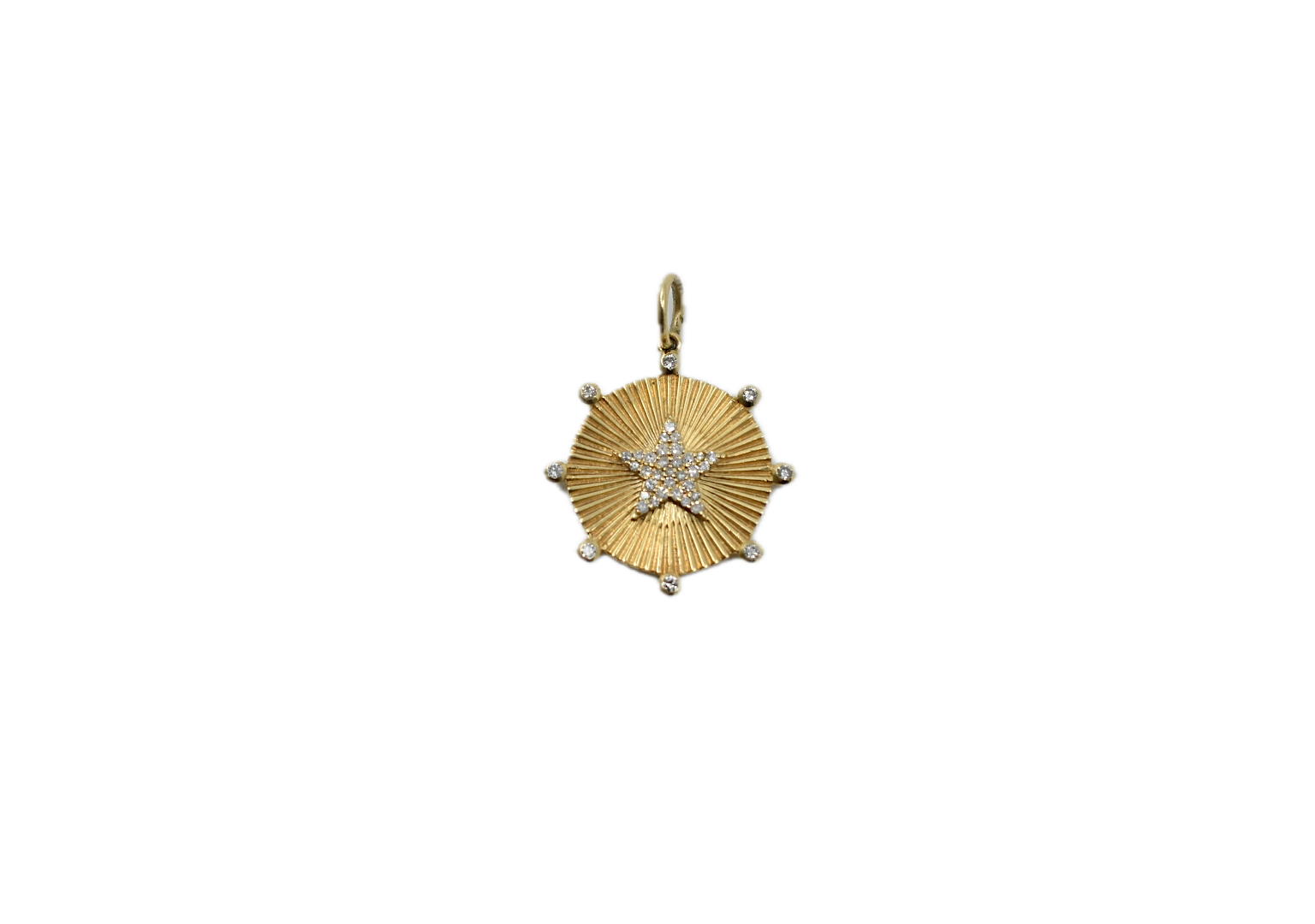 14K yellow gold fluted disc with pavé diamond star and full cut diamonds along the edge.