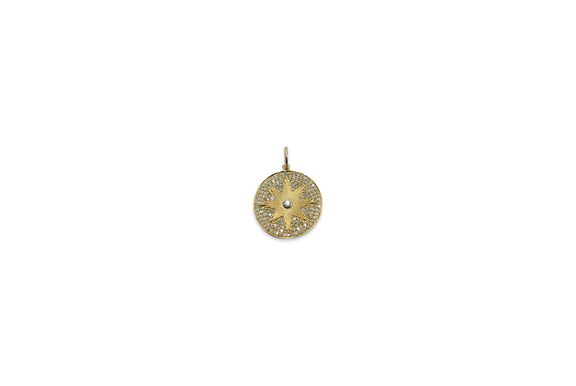 14K yellow gold disc with single cut diamonds, fluted starburst, and one full cut diamond in the center.