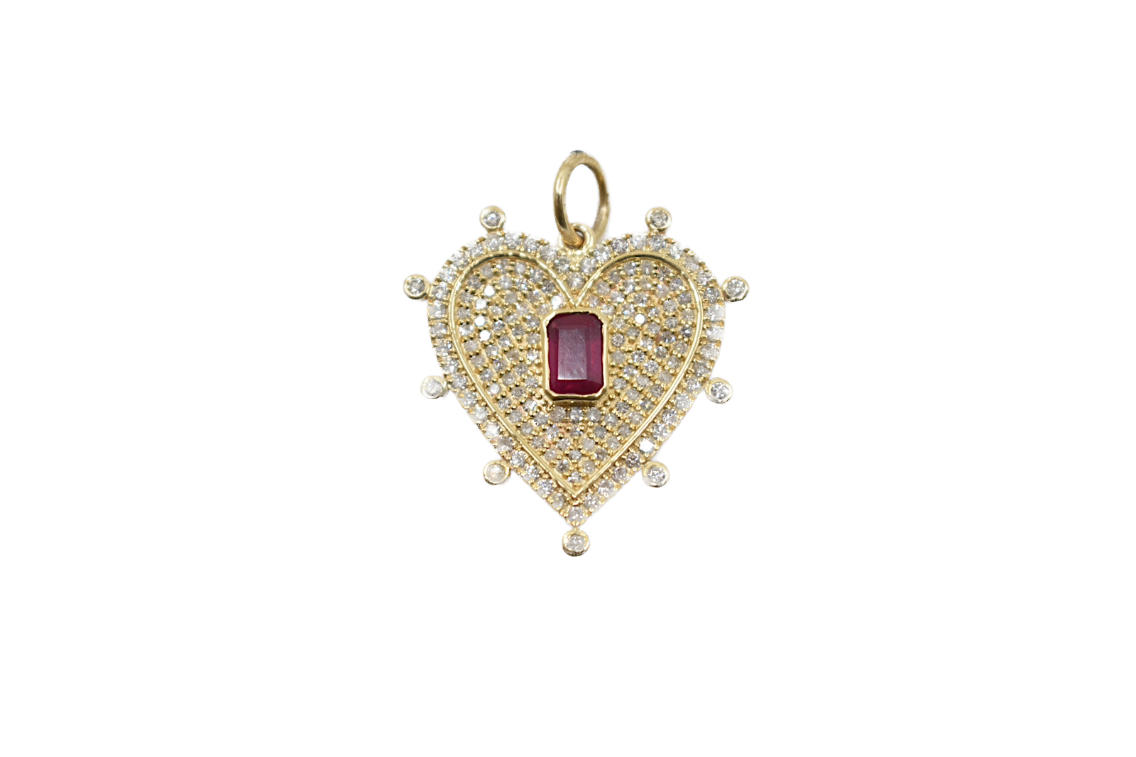 14K yellow gold heart with single cut diamonds and ruby octagon in the center.