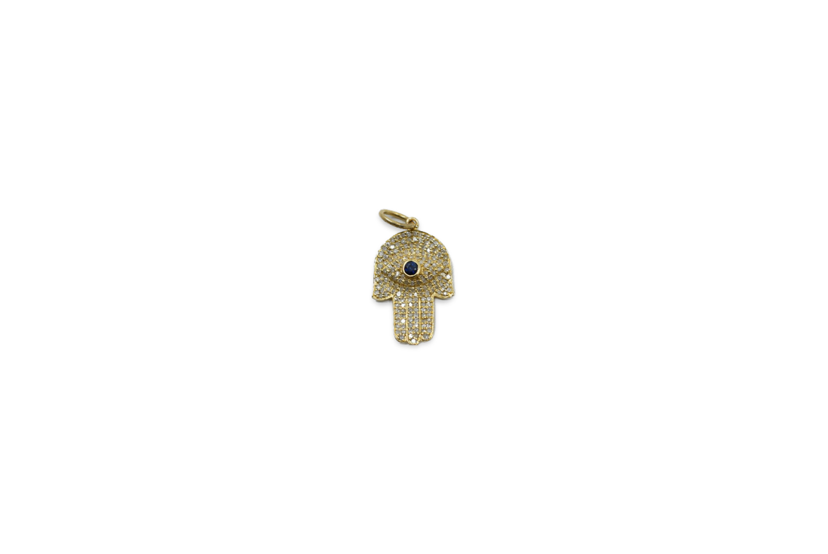 14K yellow gold hamsa with pavé diamond and blue sapphire evil eye in the center.