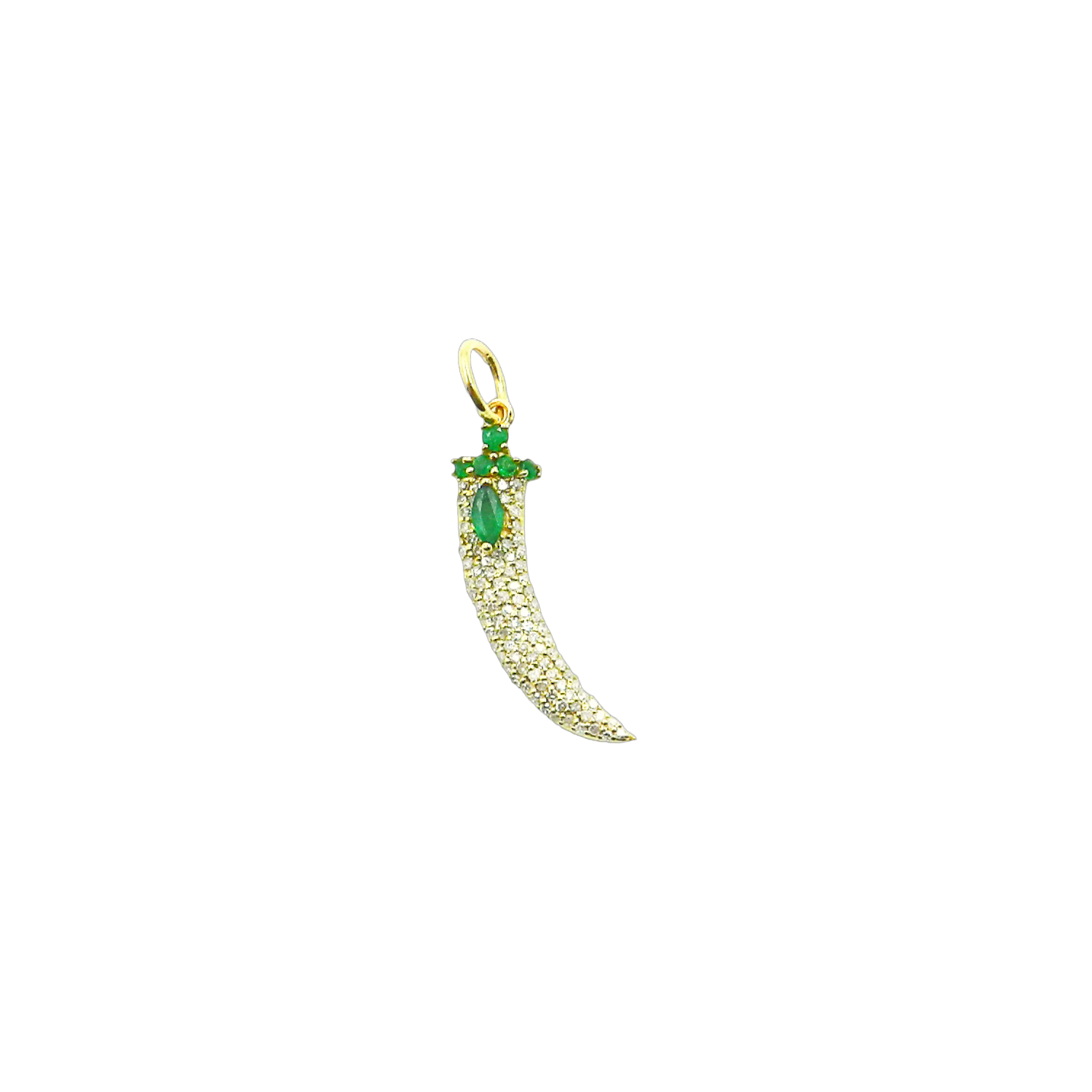 Emerald round and marquoise studded with single cut diamonds in 14k gold.